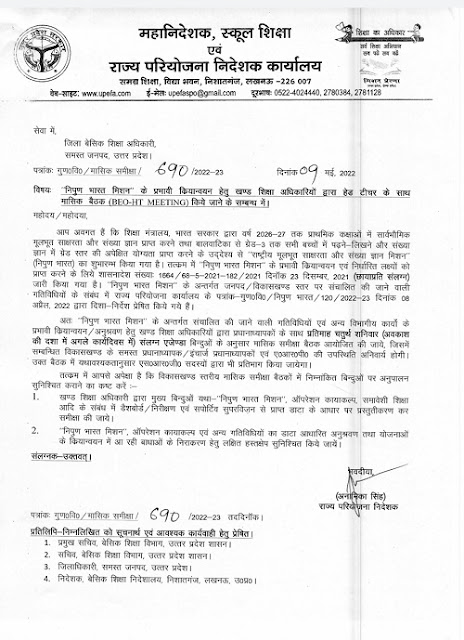 Basic Shiksha News:- "निपुण भारत मिशन‘‘ के प्रभावी क्रियान्वयन हेतु बीईओ व प्र०अ० की मासिक बैठक किये जाने के सम्बन्ध में आदेश